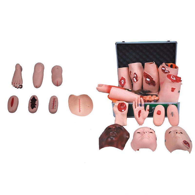 該創(chuàng)傷功能模塊涵蓋多種嚴(yán)重創(chuàng)傷情境:面部燒傷精細(xì)區(qū)分 Ⅰ、Ⅱ、Ⅲ 度,模擬不同程度損傷;頜骨創(chuàng)傷、鎖骨與胸膛挫傷、腹部創(chuàng)傷伴小腸突露等,全方位呈現(xiàn)軀干部位受傷狀況。四肢更是重點(diǎn)涉及,右上臂、右大腿、右小腿多處開放性骨折,還有右手、右足骨折及軟組織撕裂,甚至骨組織暴露、槍彈傷口等。此外,左肢同樣呈現(xiàn)燒傷、截?cái)鄤?chuàng)傷等,還包含胸壁、大腿的切開縫合傷口以及各類皮膚損傷、感染、壞疽,為創(chuàng)傷救治訓(xùn)練提供豐富場(chǎng)景。