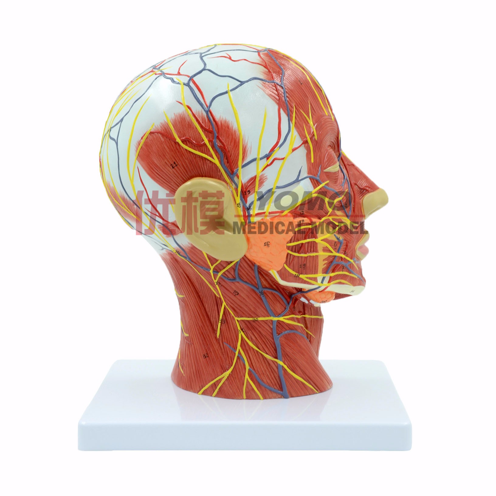 此模型為自然大頭頸淺表神經血管肌肉模型,1部件,顯示了人類右側頭頸部及正中矢切面的細節(jié),包括暴露的臉部的淺表肌肉,臉部和頭皮的淺表血管、神經及腮腺和上呼吸道的內側結構及頸椎矢狀斷面結構。