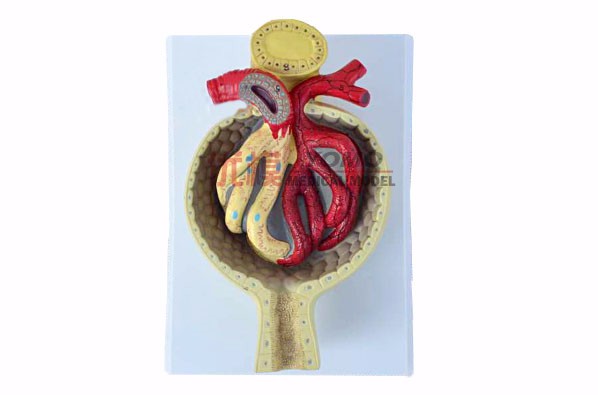 此模型為放大700倍的腎小球模型。腎小球?yàn)檠哼^(guò)濾器,腎小球毛細(xì)血管壁構(gòu)成過(guò)濾膜。