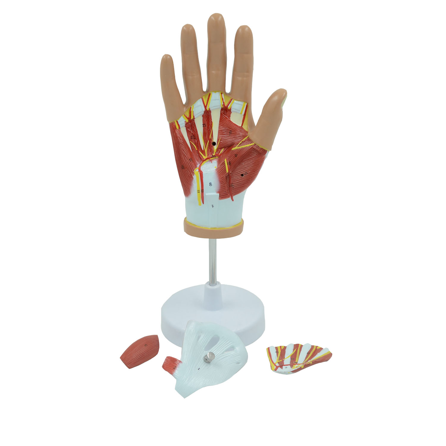 此款模型共4部件,掌腱膜和掌短肌可以拆下來,以觀察更深層次的肌肉,肌腱,血管和神經(jīng)網(wǎng)絡(luò)。深層的掌部斷面出示了長健,腕部韌帶和正中神經(jīng)。手掌機部分拆下后,可以看到手掌弓及其分支和神經(jīng)分布。1比1大小,方便教學(xué)使用。
