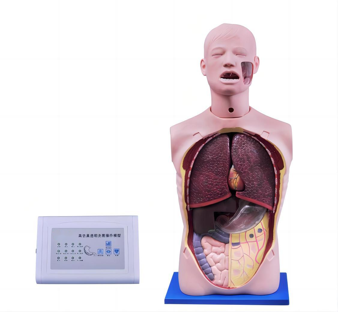 ■ 模型為成人上半身,解剖結(jié)構(gòu)精確,口腔內(nèi)有牙、舌、懸雍垂、呼吸道聲門、會厭、喉等解剖結(jié)構(gòu),具有氣管、支氣管、左右肺臟、心臟、食管、胃、膈、肝臟、膽囊、胰腺以及小腸、結(jié)腸等結(jié)構(gòu)