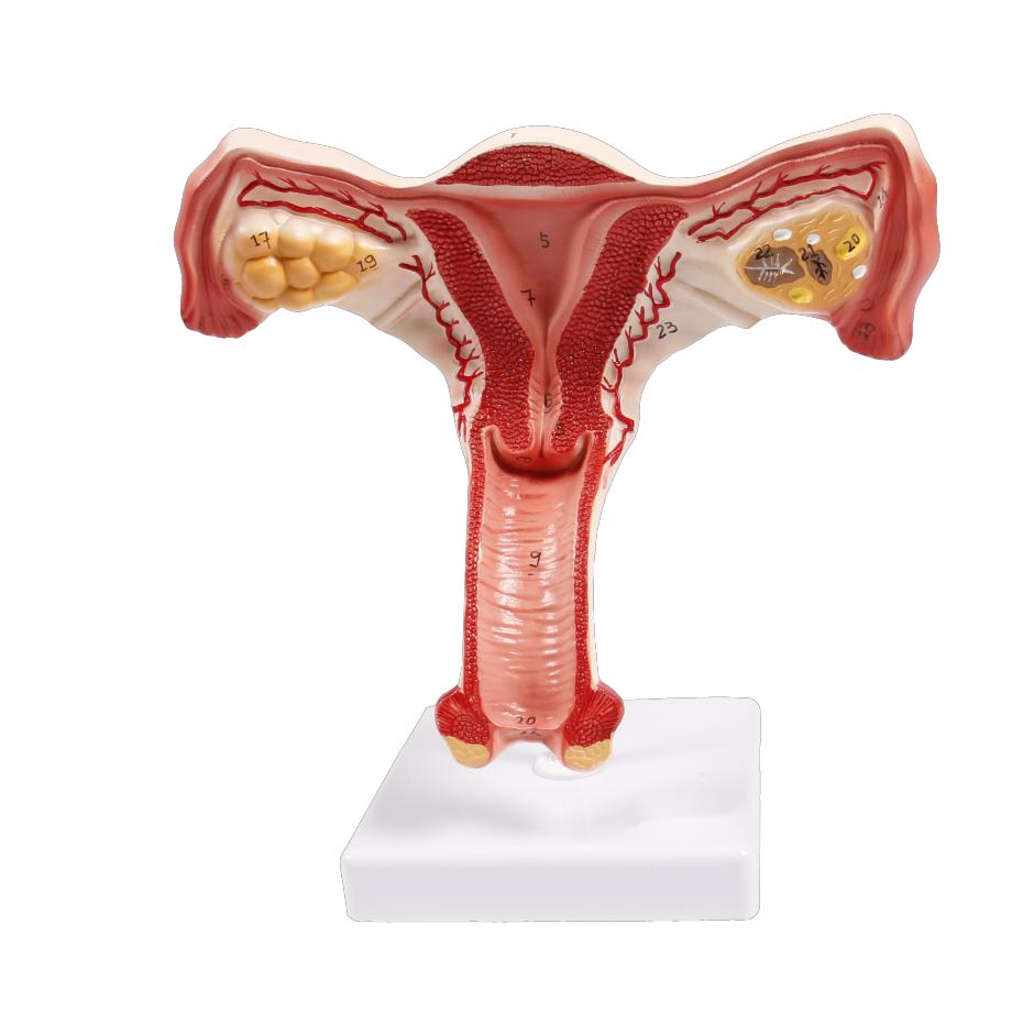本模型顯示子宮三層結構,子宮腔陰道示穹隆,左側示卵巢、輸卵管各部和子宮闊韌帶的關系,右側卵巢剖面示黃體、卵泡、子宮血管及子宮圓韌帶等。