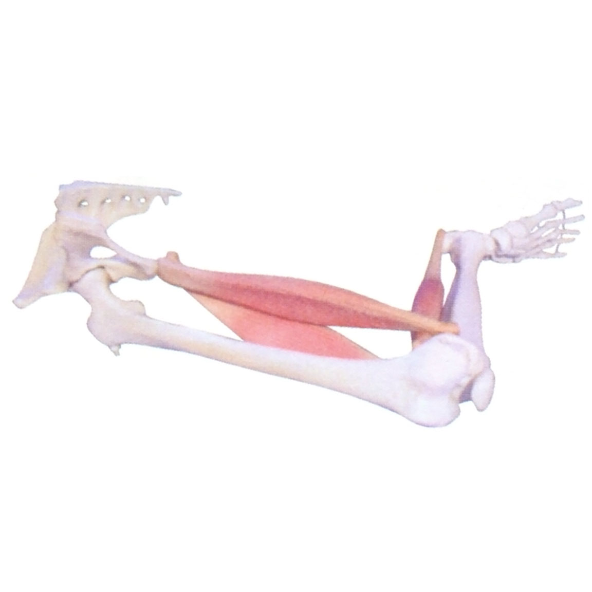 • 一手將骨盆置于后傾位,足固定于桌面上,另一手將膝關(guān)節(jié)置于160度左右,此間只要把扶住膝關(guān)節(jié)的手松開,可觀察到由于股后肌群模型和腓腸肌模型的彈性(表示肌肉收縮),膝關(guān)節(jié)則向后移動(dòng),表明上述肌肉在協(xié)助股四頭肌完成仲膝動(dòng)作。此演示說明了雙關(guān)節(jié)肌的反常作用。